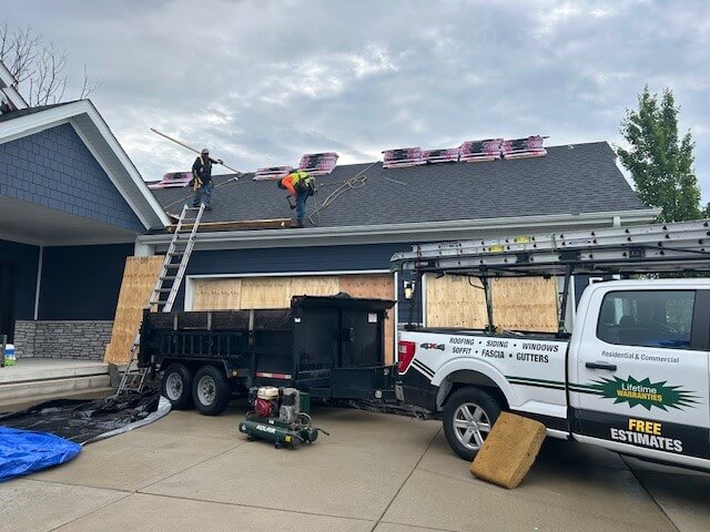 A roofing project generates a large amount of debris โ especially when tearing off old shingles. To keep the site safe and organized, contractors place a dump trailer in the driveway. This provides a central location for disposing of shingles, nails, and underlayment. By managing debris efficiently, the crew reduces hazards around the property and makes cleanup smoother at the end of the project.
